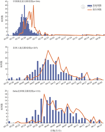 (2)发病日期与报告日期间隔:我国湖北省关联疫情、非洲入境关联疫情和Delta变异株关联疫情病例的发病与报告日期间隔M(P25,P75)分别为6(3,9)、2(1,3)、1(1,3)d,差异有统计学意义(H=269.84,P<0.05)。两两比较结果显示,湖北省关联疫情的发病日期与报告日期间隔明显大于另外2起疫情。绘制发病日期与报告日期的流行曲线结果显示,湖北省关联疫情的发病日期曲线与报告日期曲线变化趋势基本相似,但相比于发病日期曲线,报告日期曲线整体滞后约1周,另外2起疫情的发病日期与报告日期曲线基本吻合。见图1。
