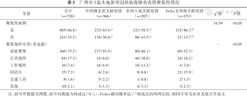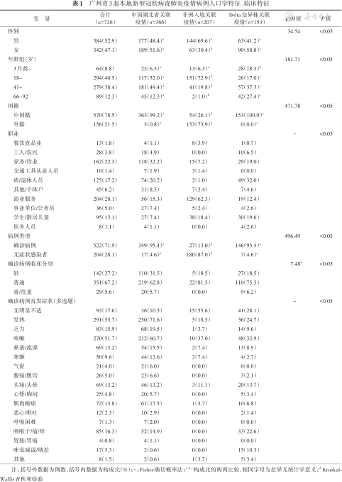 | 变量 | 合计 (n=726) | 中国湖北省关联疫情(n=366) | 非洲入境关联疫情(n=207) | Delta变异株关联疫情 (n=153) | χ2值 | P值 |