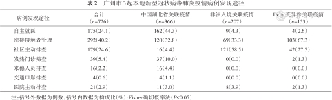 | 病例发现途径 | 合计 (n=726) | 中国湖北省关联疫情 (n=366) | 非洲入境关联疫情 (n=207) | Delta变异株关联疫情 (n=153) |