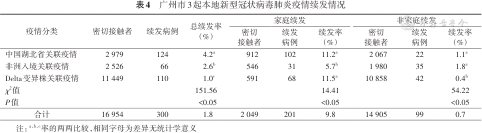 (2)续发率:我国湖北省关联疫情、非洲入境关联疫情和Delta变异株关联疫情的续发率分别为4.2%、2.6%和1.0%。3起疫情在总续发率、家庭续发率、非家庭续发率的差异有统计学意义(均P<0.05)。见表4。