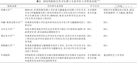 | 中国院校 | 9所院校有3所院校全日制只招收预防医学以及相关专业的本科毕业生,其中2所院校要求非全日制申请者也具有本科学位;申请者具有本科学位或同等学历 | 全日制和(或) 非全日制 | 通过研究生入学考试 |