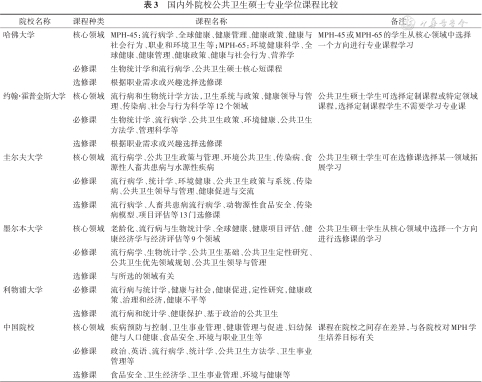 | 中国院校 | 核心领域 | 疾病预防与控制、卫生事业管理、健康管理与促进、妇幼保健与人口健康、食品安全、环境与职业卫生等 | 课程在院校之间存在差异,与各院校对MPH学生培养目标有关 |