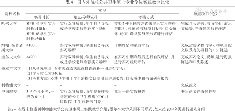 5. 专业实践:专业实践是培养MPH学生极其重要的一个环节,能让学生将课程学到的理论知识应用到实际中去,解决当前公共卫生领域面临的问题。国外院校专业实践有实习和顶点项目。利物浦大学只有论文要求,没有检索到实习的内容;墨尔本大学将实习和顶点项目整合到一起,学生可以选择进行研究或实习。国内院校专业实践分为实习和论文撰写(表4)。