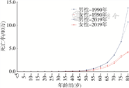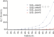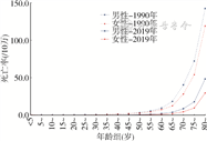 3. 不同种类CRD死亡率的年龄别及性别差异:①COPD:1990年与2019年,COPD死亡率随年龄的增加呈上升趋势,在80~岁达到最高,男性高于女性,2019年我国不同人群COPD死亡率均低于1990年(图5)。②支气管哮喘:1990年与2019年我国不同人群支气管哮喘死亡率均随年龄的增加呈上升趋势,50岁之后更加明显,男性高于女性,2019年我国不同人群支气管哮喘死亡率均低于1990年(图6)。③尘肺:1990年与2019年,我国男性尘肺死亡率高于女性,且随年龄的增加呈上升趋势,我国不同人群尘肺死亡率与1990年相比均有所降低(图7)。④肺间质性疾病和肺结节病:1990年与2019年肺间质性疾病和肺结节病死亡率随年龄增加呈上升趋势,男性高于女性,但2019年80~岁年龄组死亡率高于1990年(图8)。