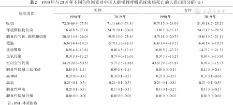1990年与2019年不同危险因素对中国人群慢性呼吸系统疾病死亡的人群归因分值(%)