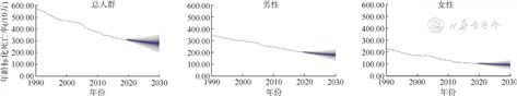 1990-2019年我国四大慢性病年龄标化死亡率(ASR)呈下降趋势,预测我国30~70岁居民四大慢性病死亡数将由2020年的296.12万例增加至2030年的318.50万例,ASR将由2020年的308.49/10万下降至2030年的277.80/10万,与2015年的330.46/10万相比,2030年仅下降15.94%,其中男性下降18.73%,女性下降14.31%。另外心脑血管疾病下降25.09%,癌症下降4.76%,慢性呼吸系统疾病下降37.21%,而糖尿病基本不变。