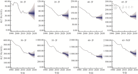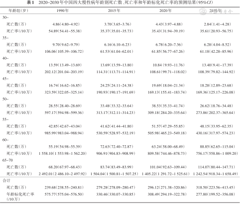 2020-2030年中国四大慢性病年龄别死亡数、死亡率和年龄标化死亡率的预测结果(95%CI)