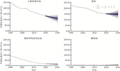通过中国30~70岁居民1990-2019年心脑血管疾病、糖尿病、慢性呼吸系统疾病和癌症四大慢性病死亡趋势,预测2030年我国四大慢性病实现可持续发展目标(SDGs)3.4.1的情况。