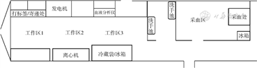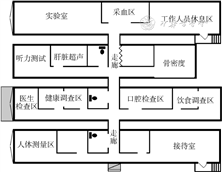 4. 实验室检查:全部内容为:血、尿、阴茎/阴道拭子、口腔灌洗剂、家庭食用盐样品、家庭水样品、孕检。除了婴幼儿,其他受试者都需要采血。其中,采集家庭里的盐和水时,扫描样品容器的二维码,标签信息自动存入CAPI的样品采集程序模块中。移动体检车中的血液分析仪采用Coulter® DxH 800,化验结果输入到综合调查信息系统中。实验室检查区域在MEC的第4辆车中,具体内部布局见图4[13]。