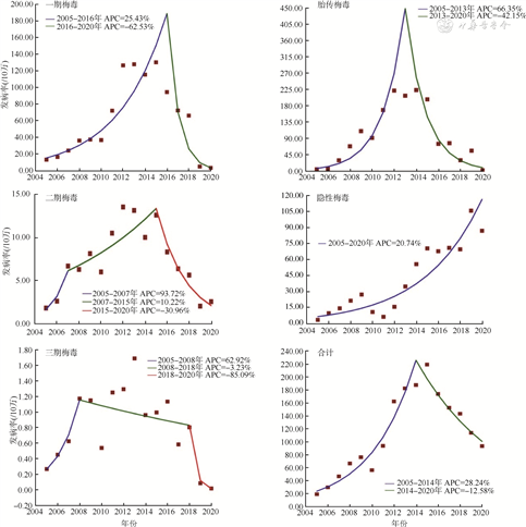2. 统计学分析:采用描述性流行病学方法,以梅毒报告数为分子、人口数为分母,计算历年各类型梅毒的报告发病率,分析一、二、三期梅毒、隐性梅毒及胎传梅毒的流行趋势以及人口学特征,包括患者年龄和性别特征、职业分布等。采用SPSS 22.0软件进行统计学分析,采用发病数、发病率和构成比等指标进行描述性流行病学分析,率的检验采用χ2检验,双侧检验,检验水准α=0.05。采用Joinpoint 4.8.0.1软件计算各年度变化百分比(APC)、平均年度变化百分比(AAPC),采用Joinpoint回归模型进行时间趋势分析[5],本研究设置模型最多允许3个连接点,P<0.05为连接点有统计学意义。