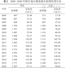 隐性梅毒在2005-2020年报告发病率一直呈上升趋势,2018年起隐性梅毒占比超过一期梅毒,成为喀什地区梅毒主要流行类型。其他研究也发现,隐性梅毒已经成为梅毒流行的主要种类,隐性梅毒病例的增加与近些年大力推行的梅毒扩大筛查策略有关[12, 13, 14]。隐性梅毒患者没有临床症状,只有通过血清学才能诊断,但同样具有传染性,其传播具有隐匿性,因此需要高度重视隐性梅毒的筛查工作,及时发现相关的隐性梅毒病例,提供积极的治疗、健康教育和心理疏导,对进一步有效控制梅毒的传播具有重要意义。