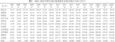 2005-2020年喀什地区梅毒报告发病率地区分布(/10万)