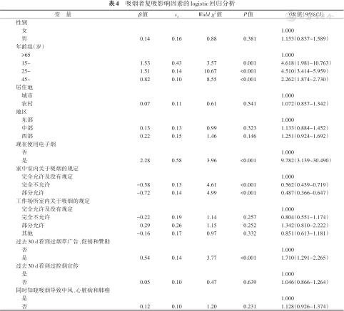 4. 影响复吸率的多因素分析:复杂抽样的多因素logistic回归模型分析结果显示,15~、25~及45~岁年龄组吸烟人群的复吸率分别是≥65岁年龄组的4.618(95%CI:1.981~10.763)倍、4.510(95%CI:3.414~5.959)倍和2.262(95%CI:1.874~2.730)倍。现在使用电子烟者复吸率是未使用电子烟者的9.782(95%CI:3.139~30.490)倍。家中室内完全不允许吸烟和部分允许吸烟的复吸率分别为完全允许吸烟及没有规定的0.562(95%CI:0.439~0.719)倍和0.487(95%CI:0.366~0.647)倍。过去30 d看到过烟草广告、促销和赞助者的复吸率是未看到者的1.710(95%CI:1.291~2.265)倍。不同性别、居住地、地区、工作场所室内有无禁烟规定、过去30 d是否看到过控烟宣传以及是否同时知晓吸烟导致中风、心脏病和肺癌之间复吸率差异无统计学意义(P>0.05)。见表4。