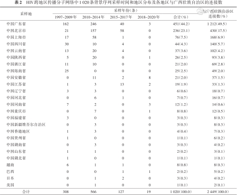 (1)HIV pol区序列:①广西CDC于1997- 2020年开展的HIV分子流行病学调查;②洛斯阿拉莫斯实验室HIV数据库(LANL HIV database,https://www.hiv.lanl.gov/)中发表的全球HIV pol区序列。纳入标准:①位于HIV HXB2CG标准参考毒株(Accession:K03455)相对位置2 253~3 554 nt;②长度≥1 000 nt;③混合碱基比例<5%;④有采样时间和采样地点。排除标准:①LANL HIV database标注“存在疑问”(problematic);②1例HIV感染者存在多条不同时间点检测的序列时,保留最早的一条;③可疑污染序列。最终获得5 996条广西序列和165 534条非广西序列。