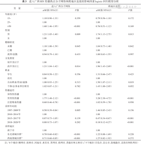 进入广西HIV传播热点分子网络和跨地区连接的影响因素logistic回归模型分析