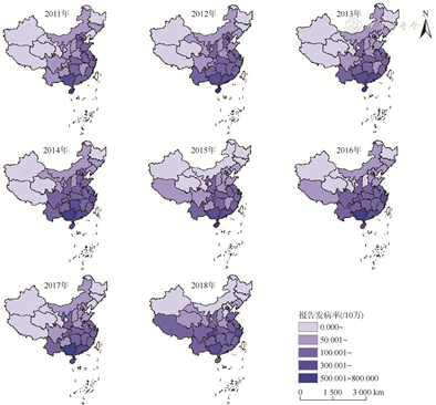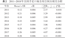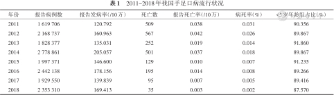 2011-2018年我国手足口病防控重点区域为东南沿海地区,在加快城市化进程的同时需考虑增加人均公园绿地面积,以降低手足口病的发病率。