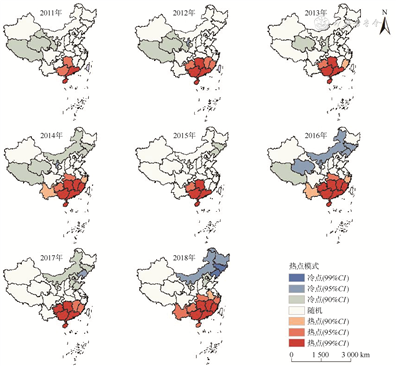 2. 手足口病空间自相关分析和热点分析:2011-2018年我国手足口病全局空间自相关分析结果显示,全局Moran's I值均>0,呈正相关,且均有统计学意义(P<0.05),表明手足口病的发病具有空间聚集性,高发地区与高发地区相邻,低发地区与低发地区相邻(表2)。对我国手足口病报告发病率进行热点分析,热点区域主要分布在华南地区且范围有逐渐扩大的趋势,广东省、广西壮族自治区和海南省为常年热点区域,华东、华中和西南的部分地区为热点区域,包括湖南省、江西省、福建省和贵州省;冷点区域主要分布在东北、华北和西北地区(图3)。