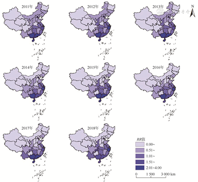 2011-2018年我国东南沿海地区手足口病的发病风险较高,是我国手足口病防控的重点区域。就2018年而言,手足口病发病风险>1.00的地区主要在华南、华东、华中等地区,有浙江省(RR=2.57)、上海市(RR=1.91)、广西壮族自治区(RR=1.86)、海南省(RR=1.82)、重庆市(RR=1.55)、广东省(RR=1.52)、江苏省(RR=1.46)、福建省(RR=1.33)、北京市(RR=1.28)、湖南省(RR=1.28)、云南省(RR=1.20)、陕西省(RR=1.11)、安徽省(RR=1.04)、湖北省(RR=1.03),其余17个省份发病风险均<1.00(图4)。