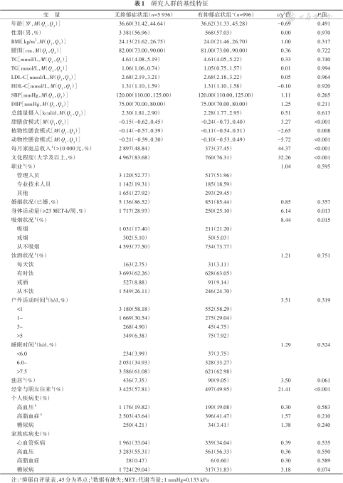 | 变 量 | 无抑郁症状组(n=5 936) | 有抑郁症状组a(n=996) | t/χ2值 | P值 |