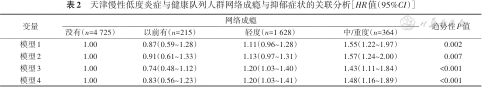 | 模型2 | 1.00 | 1.16(0.97~1.37) | 1.34(1.07~1.68) | 0.108 |