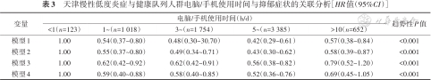 天津慢性低度炎症与健康队列人群电脑/手机使用时间与抑郁症状的关联分析[HR值(95%CI)]