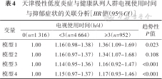 | 模型4 | 1.00 | 0.83(0.56~1.23) | 1.20(1.03~1.41) | 1.48(1.16~1.89) | <0.001 |