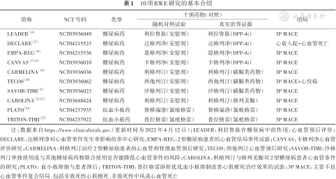 注:数据来自https://www.clinicaltrials.gov.(更新时间为2022年4月12日);LEADER:利拉鲁肽在糖尿病中的作用:心血管预后评价;DECLARE:达格列净对心血管事件发生率影响的多中心研究;EMPA-REG:2型糖尿病患者的心血管结局事件试验;CANVAS:卡格列净心血管评价研究;CARMELINA:利格列汀治疗2型糖尿病患者的心血管和肾微血管预后研究;TECOS:西他列汀心血管预后研究;SAVOR-TIMI:沙格列汀单独使用或与其他糖尿病药物联合使用是否能降低心血管事件的风险;CAROLINA:利格列汀与格列美脲对2型糖尿病患者心血管事件的研究;PLATO:血小板抑制与患者预后;TRITON-TIMI:普拉格雷溶栓优化血小板抑制改善心肌梗死治疗效果的试验;3P MACE:主要不良心血管事件复合结局,包括非致死性心肌梗死、非致死性中风或心血管死亡