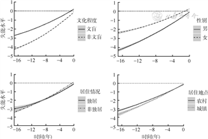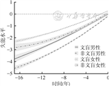性别和文化程度交互作用分析显示,在临终前17年间,非文盲男性失能水平始终是最低的,与其他组差异均有统计学意义(P<0.001)。文盲男性与非文盲女性之间差异有统计学意义(P<0.05)。见图3。