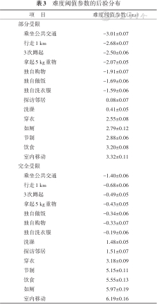 2. 难度阈值参数:难度阈值参数越低的项目越容易失能。IADL中,除了探访邻居(完全受限)难于BADL中的洗澡(部分受限及完全受限),其他IADL项目失能均易于BADL。见表2,3。