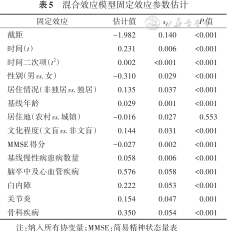 4. 失能发展轨迹:失能水平与随访时间的一次项系数与二次项系数分别为0.231(P<0.001)与0.002(P<0.001)。见表5。提示随着随访时间的增加,失能水平也不断增高,失能水平的增速也会加快。除此之外,性别、是否独居、基线MMSE得分、基线慢性病患病数量、基线年龄和文化程度均与老年人的失能水平有关,研究纳入的4种疾病均会提高失能水平且有统计学意义(P<0.05)。