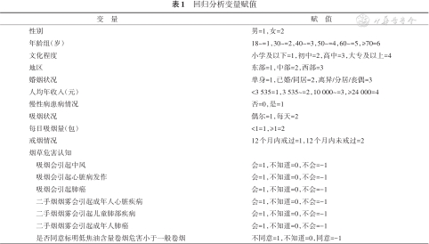 4. 统计学分析:使用SAS 9.4软件进行统计学描述、分析。为使调查结果具有全国代表性,本研究运用复杂抽样加权调整方法,综合考虑抽样、无应答和事后分层权重。采用x±s、频数与构成比分别描述定量与定性资料。定量资料组间比较,若方差齐采用单因素方差分析;若方差不齐,采用Wilcoxon秩和检验。定性资料组间比较采用χ2检验。影响因素分析中,以现在吸烟者是否有戒烟意愿为因变量,单因素影响分析采用组间比较;筛选出单因素分析中有关联的戒烟意愿影响因素作为自变量纳入模型,进行非条件多因素logistic回归分析,变量赋值见表1。所有统计学检验水准均为双侧检验,以P<0.05为差异有统计学意义。