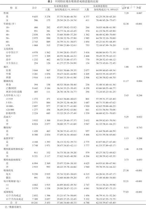 | 特 征 | 合计 | 有戒烟意愿组 | 无戒烟意愿组 | χ2/F值 | P值 | ||