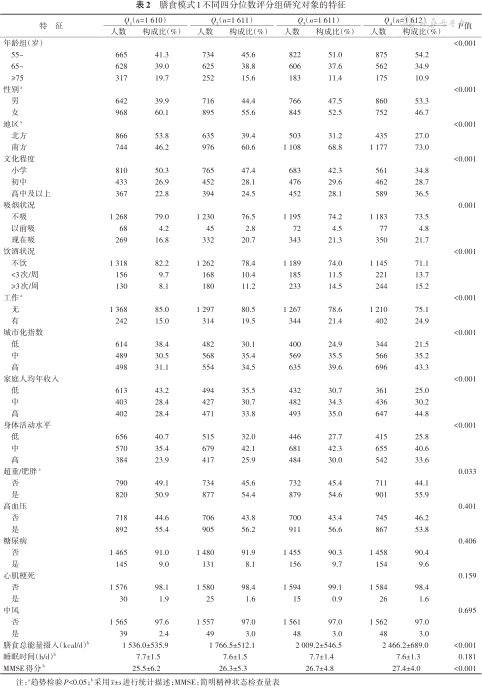 2. 不同膳食模式评分中老年人的特征:膳食模式1不同四分位数评分下,研究对象的年龄、性别、地区、文化程度、吸烟状况、饮酒状况、工作、城市化指数、家庭人均年收入、身体活动水平、超重/肥胖、膳食总能量摄入和MMSE得分的分布均差异有统计学意义(P<0.05)。其中,趋势性分析发现,男性、南方地区、有工作和超重/肥胖的比例随膳食模式1 评分的增加而增加(趋势检验P<0.05)。见表2。