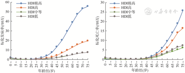 1. 资料来源:发病和死亡数据来自国际癌症研究署(International Agency for Research on Cancer,IARC)和WHO合作的GLOBOCAN 2020项目(https://gco.iarc.fr/today/home,本研究数据截至2022-05-10),提取国际疾病分类第十版(ICD-10)编码为C64的肾癌数据进行横向分析,GLOBOCAN 2020项目覆盖了全球约1/3的人口。采用联合国发展计划署公布的HDI划分标准将全球国家分为4级,即极高(HDI≥0.8)、高(0.7≤HDI<0.8)、中等(0.55≤HDI<0.7)、低(HDI<0.55);HDI极高国家包括了全部发达国家,其余HDI国家均为发展中国家[3]。根据年龄将人群按每5岁分组,共分为16个年龄组:0~、5~、10~、……、65~、70~和≥75岁。
