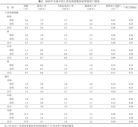 2. 全球肾癌死亡病例的流行病学特征:2020年全球肾癌患者死亡17.9万例(其中男性为11.5万例,女性为6.4万例)。死亡病例数也随国家HDI升高而增加,且男性死亡病例数均高于女性。全球肾癌ASMR为1.8/10万,男性为2.5/10万,女性为1.2/10万,极高或高HDI国家男性ASMR(2.4/10万~3.7/10万)约为中等或低HDI国家男性(1.1/10万~1.4/10万)的2倍,而不同HDI国家女性ASMR(0.6/10万~1.5/10万)差异不大。2020年中国肾癌死亡病例4.3万例,美国肾癌死亡病例1.5万例。35~64岁截缩死亡率为2.1/10万,0~74岁全人群累积死亡风险为0.20%。M/I随HDI增加而降低,中国M/I为0.58,高于全球平均水平(0.39)以及美国(0.17)。见表2。