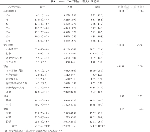 1. 基本情况:2019-2020年共74 475人纳入最终分析,其中男性37 365人,女性37 110人。50~54岁年龄组占比最大(17.5%);文化程度以小学及以下最多(46.0%);职业以农林牧渔水利业最多(32.2%),其次是家务/离退休人员(30.8%);城镇人群(59.6%)占比高于乡村(40.4%),东部地区人群占比(42.8%)高于中部(30.6%)和西部(26.6%)。见表1。