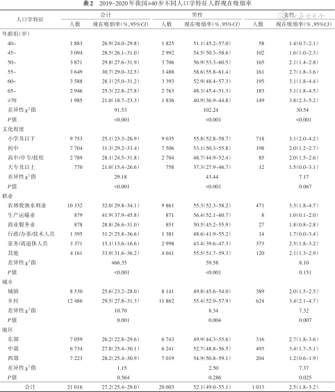 2019-2020年我国≥40岁不同人口学特征人群现在吸烟率