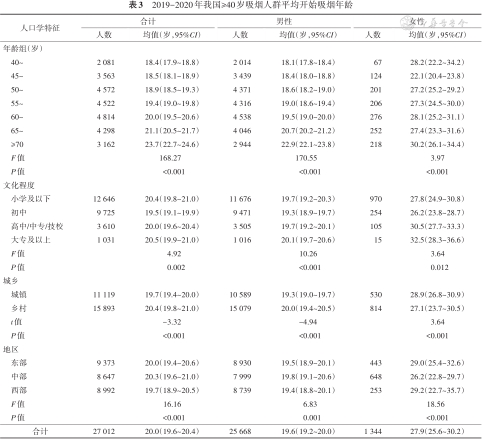 3. 平均开始吸烟年龄:2019-2020年我国≥40岁吸烟人群的平均开始吸烟年龄为20.0岁,男性19.6岁,女性27.9岁;男性年龄越大,平均开始吸烟年龄越晚;大专及以上文化程度人群最晚(20.5岁);城镇人群(19.7岁)早于乡村(20.4岁)(P<0.001);西部地区人群平均开始吸烟年龄最早(19.7岁),东部和中部地区分别为20.0和20.3岁。见表3。