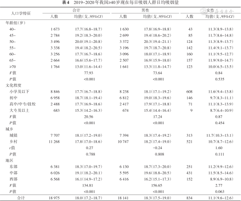 近年来,我国≥40岁人群的现在吸烟率和日均吸烟量有所下降,但仍有超过四分之一的人群及一半以上男性现在吸烟。应结合人群和地域特征,研究实施针对性的控烟措施以进一步降低人群吸烟水平。