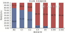 3. 基因亚型的分布:不同民族的亚型构成存在差异,B型检出4个亚型,除藏族以外,B2亚型是汉、瑶和彝族等13个民族的优势亚型;C型检出6个亚型,汉族的C1和C2亚型分别占31.34%(63/201)和56.22%(113/201);壮和瑶族的C5亚型分别占55.56%(15/27)和84.62%(33/39);藏、彝、蒙古、满和回族的C型中C2亚型占比较高,壮和瑶族未检出C2亚型;彝族的D型均为D3亚型;维吾尔和哈萨克族的D型均为D1亚型。藏族的C/D型中,C/D1和C/D2亚型分别占46.63%(152/326)和53.37%(174/326)。见表2。11例I型均为I1亚型。汉、壮、彝、苗和布依族以B2亚型为主,分别占71.89%(601/836)、47.83%(33/69)、48.94%(23/47)、91.18%(31/34)和81.48%(22/27);蒙古、满和回族以C2亚型为主,分别占47.06%(8/17)、83.33%(10/12)和85.71%(6/7);瑶族以C5亚型为主,占60.00%(33/55);维吾尔族以D1亚型为主,占83.78%(31/37);藏族以C/D1和C/D2亚型为主,分别占43.06%(152/353)和49.29%(174/353)。见图1。