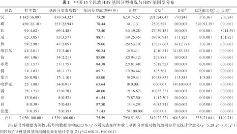 我国15个民族中发现HBV 5种基因型和15种基因亚型,不同民族的HBV基因型和基因亚型分布差异明显。