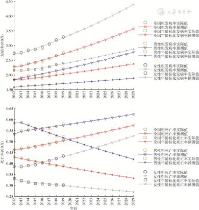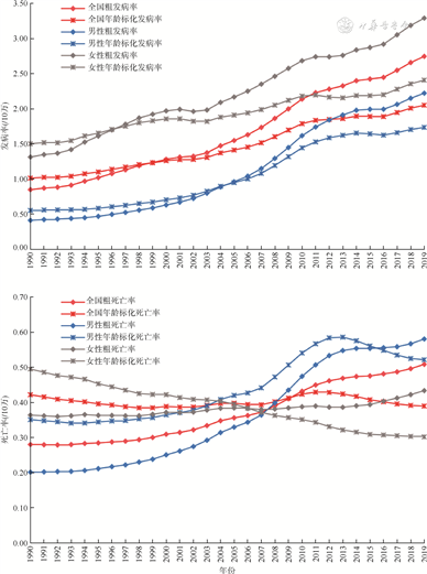 全国、男性、女性年龄标化死亡率近10年呈下降趋势,预测结果显示未来可能进一步下降,但粗发病率、年龄标化发病率和粗死亡率一直处于上升状态,且中国人口老龄化程度日益加剧,需要密切关注并实施有针对性的防控措施。