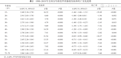 1990-2019年全国分年龄组甲状腺癌发病和死亡变化趋势