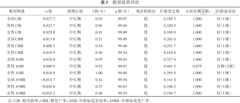 4. 模型评价:所有模型满足-a≤0.300 0,表明均可进行中长期预测。残差检验法结果显示:所有e≤10.00%且>80.00%,表明模型预测效果均优。后验误差法结果显示:预测精度除男性ASIR为合格(2级)外,其余均为好(1级)。见表3。