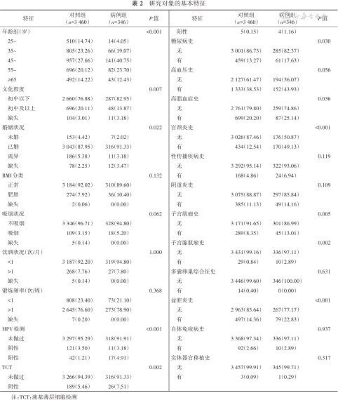 两组研究对象的基本特征和组间比较见表2。病例组与对照组年龄、文化程度、婚姻状况分布差异有统计学意义;病例组与对照组之间做过HPV检测和TCT的人数分布差异有统计学意义,病例组与对照组有宫颈炎史、子宫肌瘤史、子宫腺肌瘤史、盆腔炎史的比例差异均有统计学意义(P<0.05),有糖尿病和高脂血症的人数差异均有统计学意义(P<0.05)。
