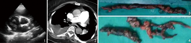 2015年10月12日行体外循环辅助双侧肺动脉切开取栓+右心房切开取栓术。术中见右心房血栓长约14 cm(图3),双侧肺动脉内取出完整血栓(图4~5),手术顺利。术后复查床旁超声心动图示右心室直径20 mm,肺动脉压52mmHg,停用去甲肾上腺素。放置下腔静脉滤器,预防血栓再次脱落,患者恢复良好,治愈出院,遗留右侧肢体活动障碍。