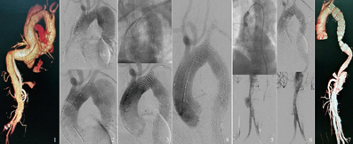 患者保守治疗2周后,在DSA X光机动态监测下手术。患者取平卧位,麻醉科行气管插管及全身麻醉,行胸主动脉腔内介入治疗+左锁骨下动脉"烟囱"置入术。穿刺左侧肱动脉,置入鞘管,切开左股动脉,置入鞘管,行主动脉造影,示胸主动脉破口位于主动脉弓降部大弯侧,破口大小约4 cm,距左锁骨下动脉0.3 cm(图2)。测量近端锚定区长度及主动脉弓部无病变处血管直径32 cm,选用COOK ZTEG-2PT-34-197 cm大动脉支架,通过加硬导丝将覆膜支架送至近端破口附近,"烟囱"支架11×5 cm沿肱动脉推送至超出左锁骨下动脉开口2 cm至主动脉内,调整静脉降压药物,将血压水平控制在100 mmHg(13.3 kPa)左右,释放覆膜支架后再释放"烟囱"支架,再次行主动脉造影,见主动脉支架头端上翘,整体向后移位,左锁骨下动脉烟囱支架向升主动脉内移位、左颈总动脉、左锁骨下动脉显影、Ⅰ型内漏(图3)。5 min后再次行主动脉造影见左锁骨下动脉烟囱支架移位至升主动脉内,与大支架无重叠,左颈总动脉、左锁骨下动脉显影,Ⅰ型内漏消失(图4)。经左股动脉导丝送入CODA40-120顺应性球囊沿主动脉大支架送入烟囱支架内,将球囊在烟囱支架内充盈成狗骨头状,用球囊带动烟囱支架沿主动脉拉入腹主动脉,封闭腹主动脉远端破口(图5),再次行主动脉造影示主体支架形态良好,左锁骨下动脉显影,无造影剂渗漏,烟囱支架位于腹主动脉一破口处,造影剂无渗漏,腹腔干附近仍存在破口(图6)。术后复查CT示主动脉支架在位,左锁骨下动脉显影,造影剂无渗漏,主动脉弓及降主动脉管腔狭窄,假腔内未见明显造影剂填充,腹腔干上方开始假腔内见造影剂,腹腔干,左肾动脉起始于真假腔,肠系膜上动脉及右肾动脉起始于真腔(图6)。患者术后无胸痛咯血,疗效基本满意。