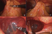 2016年11月于全麻下行腹腔镜胆囊切除术,术中发现剑突偏右1 cm处胸骨后膈肌缺损约5 cm×4 cm,大网膜经缺损处疝入胸腔,还纳大网膜入腹腔,可吸收线间断缝合膈肌缺损,术中诊断Morgagni疝,行腹腔镜下胆囊切除、Morgagni疝修补术(图5ⒸⒹ)。