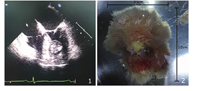 2018年5月在全麻下行左心室占位摘除术。术中经食管超声心动图再次确认左心室占位病变(图1),直视下通过主动脉瓣可见一大小约3.0 cm×2.5 cm占位,质地疏松,边界清,基底部附着于室间隔中间段,带蒂切除占位组织(图2),送检病理科。病理肉眼示:灰黄组织一块,大小约3.0 cm×2.5 cm×1.3 cm,切面灰黄灰红,质软到中。免疫组化结果示:CR(-)、ERG(+)。特殊染色:弹力EVG(+)。病理诊断:(左心室占位)乳头状弹力纤维瘤。患者术后胸痛症状明显改善,复查超声心动图、胸部CT、心电图等均未见明显异常。出院后电话随访半年,患者恢复良好,自诉无胸痛症状复发,复查超声心动图示无肿瘤复发。