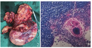2018年7月于全麻下行后外侧开胸肿瘤切除术。第7肋间进胸,探查肿瘤位于中下纵隔,较大,有完整包膜,主要为脂肪组织,与膈肌、心包、肺无明显粘连,来源于上纵隔深方脂肪组织。小心分离肿瘤,将膈神经自肿瘤中分离出来,在肿瘤上极处小心将其与左无名静脉分离,完整切除肿瘤。术中快速病理:切面灰白,实性,质软,为胸腺组织,小叶结构清楚,髓质内见钙化,未见萎缩,不除外胸腺增生。术后送检病理,肉眼见:结节状肿物1枚,大小20.5 cm×15.5 cm×7.0 cm,外附光滑包膜,厚0.1 cm,与肿物易剥离,部分包膜缺损,缺损区大小约9.0 cm×3.0 cm;肿物表面呈分叶状,切面灰黄、灰粉,细腻,质软,灰粉区针尖大点状灰黄区(图2)。病理结果示:(左侧纵隔肿物)胸腺小叶结构清楚,髓质内见钙化,未见萎缩。结合免疫组化检查结果,符合真性胸腺增生(图3)。免疫组化结果(-26):CD117(少数散在+),TdT(淋巴细胞+),CK(AE1/AE3)(上皮细胞+),CD5(+),CD20(L26)(+),Ki67(MIB-1)(+),CK19(上皮细胞+),CK5/6(上皮细胞+)。患者术后恢复可,定期随访。